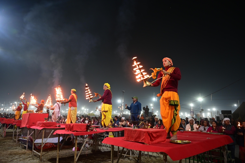 Prayagraj: Priest perform ‘Ganga Arti’ at Sangam during ongoing Mahakumbh mela in Prayagraj