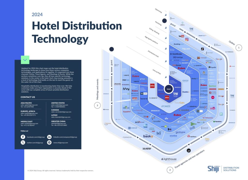 The Shiji Global Distribution Chart is the annual infographic, backed by popular demand, that they put together to show the entire hospitality tech distribution landscape. Hoteliers find this extremely useful because it helps them visualize how the various techs connect with hotels, guests, and each other.
