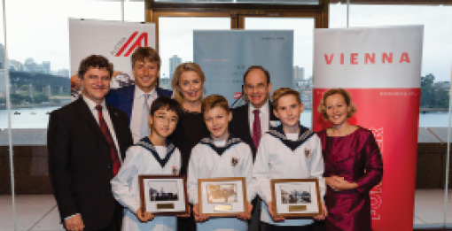 Pictured are the Vienna Boys Choir president and artistic director Prof Gerald Wirth, Austrian Consul General Karl Hartleb, ANTO Aus/NZ director Astrid Mulholland-Licht, past choir host Thomas Wenkhard and Vienna Tourism Board Aust/Canada market manager Elke Bachner, with members of the Vienna Boys Choir.